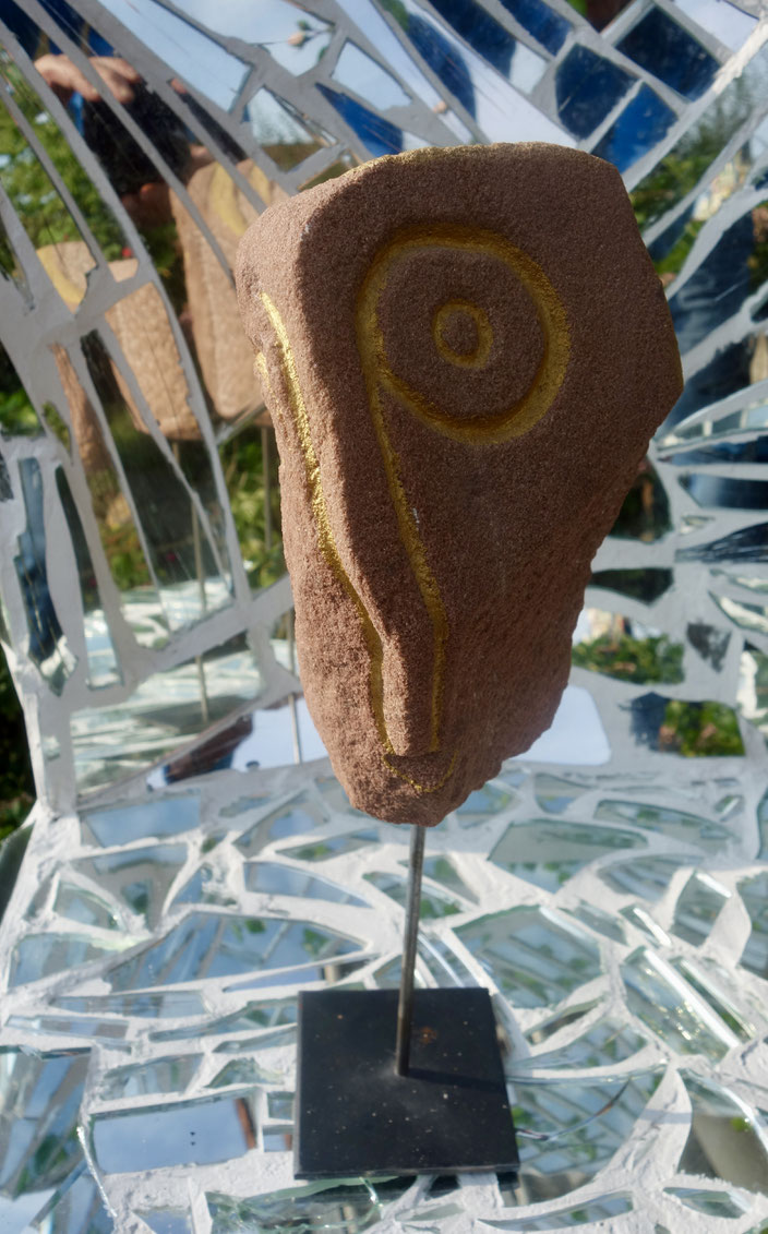 "Herabgestiegen", roter Sandstein und Goldie aus Pappmaché, ca. 15 X 30 X15 cm (BxHxT)